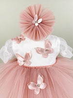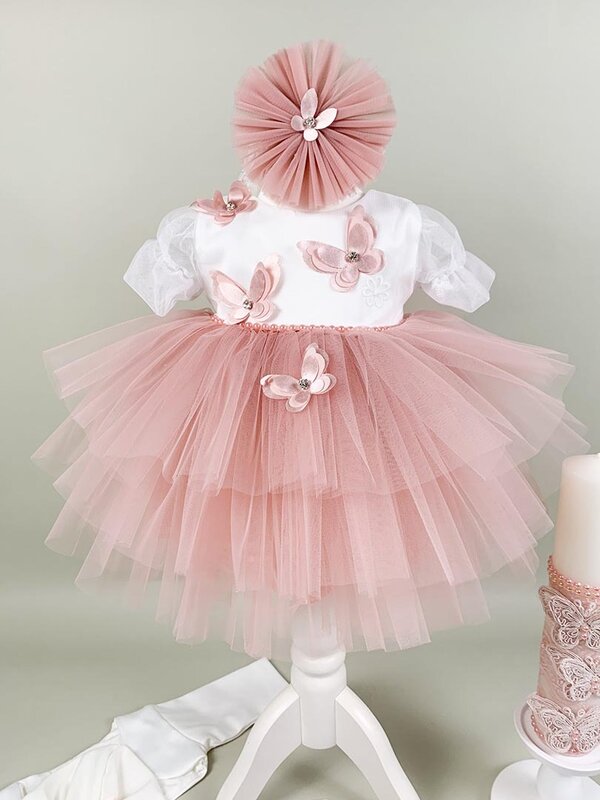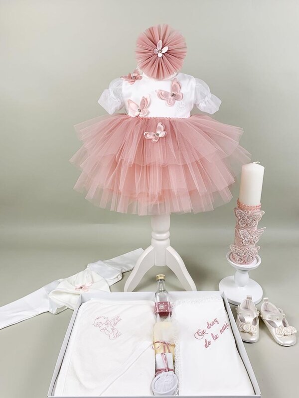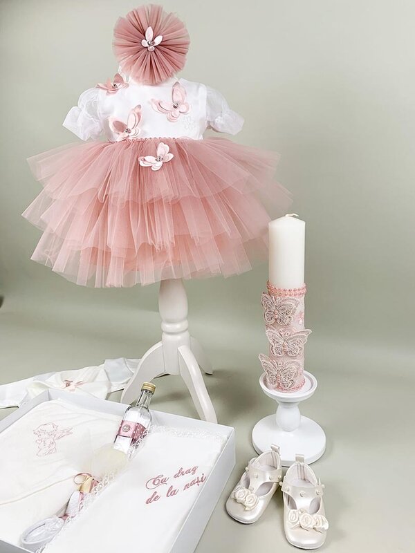 • Rochita cu fustita din tul iar partea de sus este realizata din satin alb. Este captusita pentru confortul micutei. Talia rochitei este marcata cu perlute, detaliu care accentueaza talia si ii confera elegante rochitei. Pe partea de sus se gasesc numeroase strasuri si fluturasi 3D. Manecile sunt scurte, ele sunt create din voal transparent. Este ideala pentru o aparitie spectaculoasa