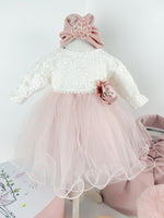Pret unitar pe- Rochita cu dantela si fustita - Rochita este confectionata din materiale fine, captusita cu bumbac si are maneci lungi. Se inchide usor cu fermoar si cordon la spate, iar partea superioara este decorata cu dantela brodata.