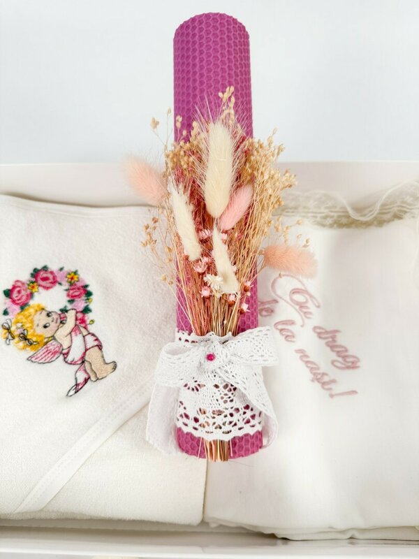 Trusou fetita cu ingeras si lumanare roz din ceara naturala