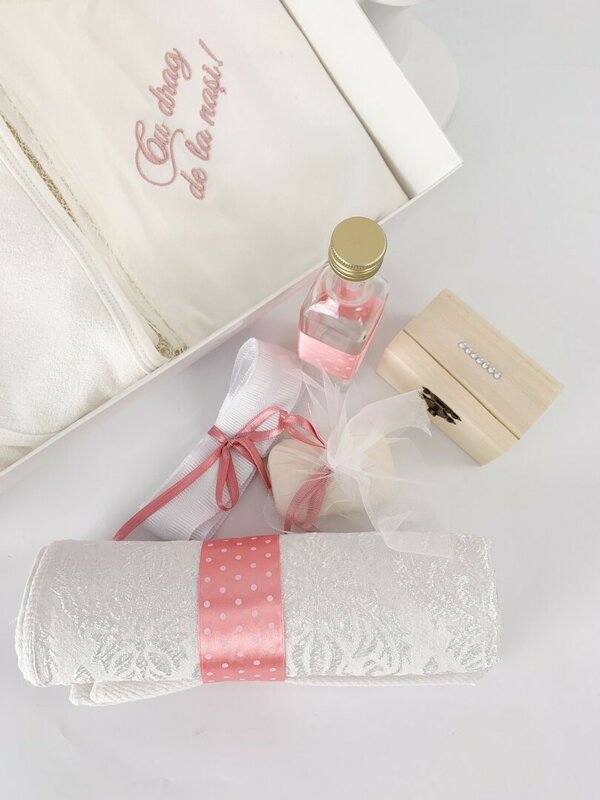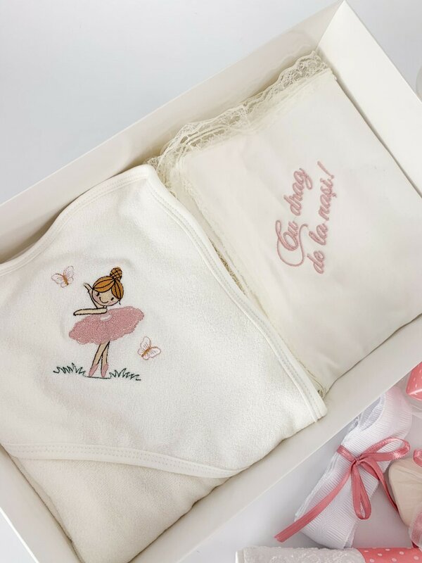 - Prosop brodat pentru bebelus – Confectionat dintr-un material moale si delicat, ideal pentru pielea sensibila a micutei, brodat cu detalii fine si elegante.