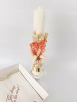Pret unitar pe- Lumanare personalizata – Realizata din ceara alba de inalta calitate, cu ardere curata, decorata manual cu flori uscate, adaugand un aspect natural si elegant, perfect pentru o ceremonie memorabila.