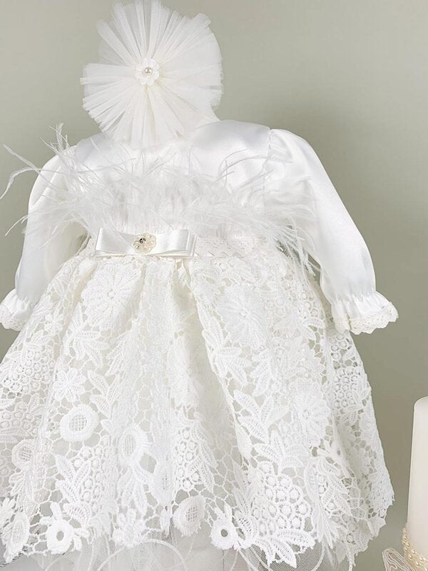 - Rochita alba realizata din dantela si captusita pentru confortul micutei. Are detalii fine iar talia rochitei este marcata cu o fundita satinata ce accentueaza talia. Rochita este dedicata evenimentelor speciale, este de efect.