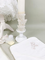 - Lumanarea pentru botez confectionata din ceara alba-ivoire si este accesorizata cu dantela.