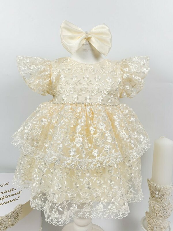 - Rochita crem – Confectionata din satin calitativ, aceasta rochie straluceste, iar dantela brodata aplicata adauga o nota de eleganta.