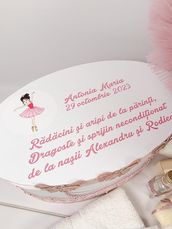 Setul este ambalat intr-o cutie mare si incapatoare, cu detalii de dantela subtila, un mesaj emotionant si o micuta balerina.