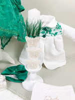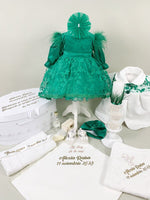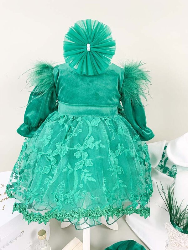 - Rochita - piesa centrala a acestui set este rochia intr-o nuanta vibranta de verde. Partea superioara din catifea ofera un aspect luxos iar fusta ampla din tul cu broderii elegante emana gratie. Manecile lungi cu pene aplicate nu doar adauga eleganta, ci si protectie impotriva frigului.