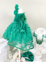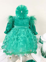 - Turban elegant din catifea moale si bentita asortata cromatic in aceeasi nuanta vibranta de verde completeaza cu stil look-ul micutei.