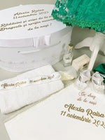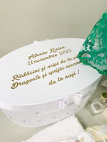 Toate aceste elemente sunt ambalate cu atentie intr-o cutie spatioasa, cu dantela subtila, personalizata cu un mesaj emotionant.