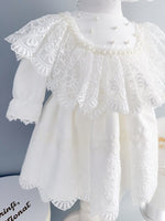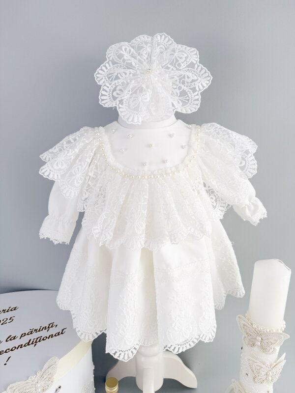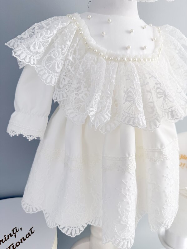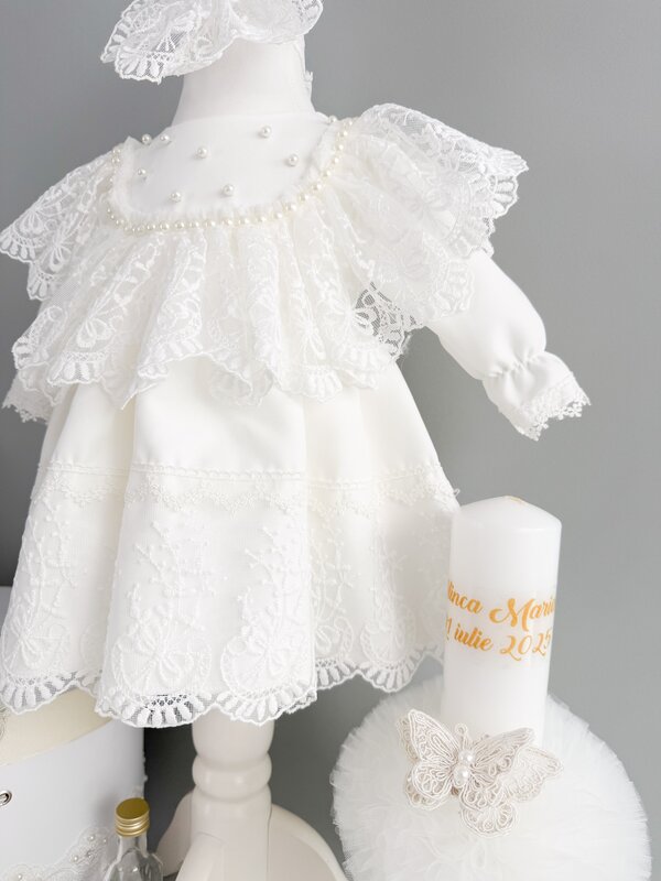 ✔ Rochita alba cu maneci lungi – O piesa eleganta, realizata din materiale fine, captusita integral cu bumbac 100% pentru confort maxim. Dantela brodata delicata si detaliile subtile precum siragul de perle din zona gatului transforma rochita intr-o alegere perfecta pentru ziua botezului.