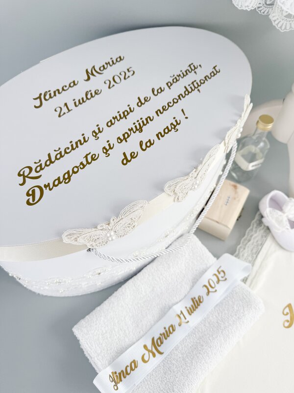 Trusoul este asezat intr-o cutie rotunda, din carton gros, special conceputa pentru a pastra cu grija amintirile acestei zile unice. Cutia este personalizata cu un mesaj emotionant si poate fi pastrata peste ani.