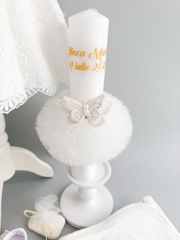 ✔ Lumanare decorata manual – Din ceara naturala, cu aspect elegant si posibilitate de personalizare completa (tematica, nume, culoare).