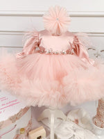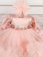 • Rochita roz-piersica - este alcatuita din cele mai delicate materiale. Partea superioara din tafta straluceste, in timp ce fusta ampla si diafana din tul confera o nota de farmec. Manecile lungi cu pene aplicate adauga o nota de rafinament.