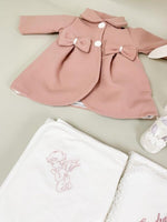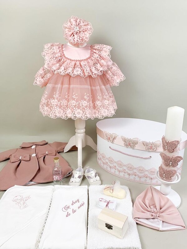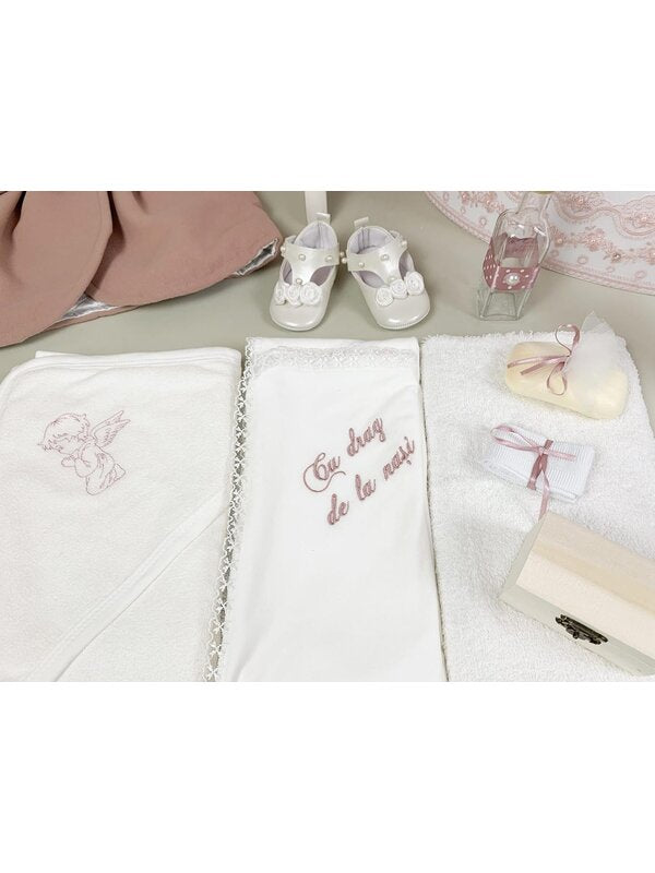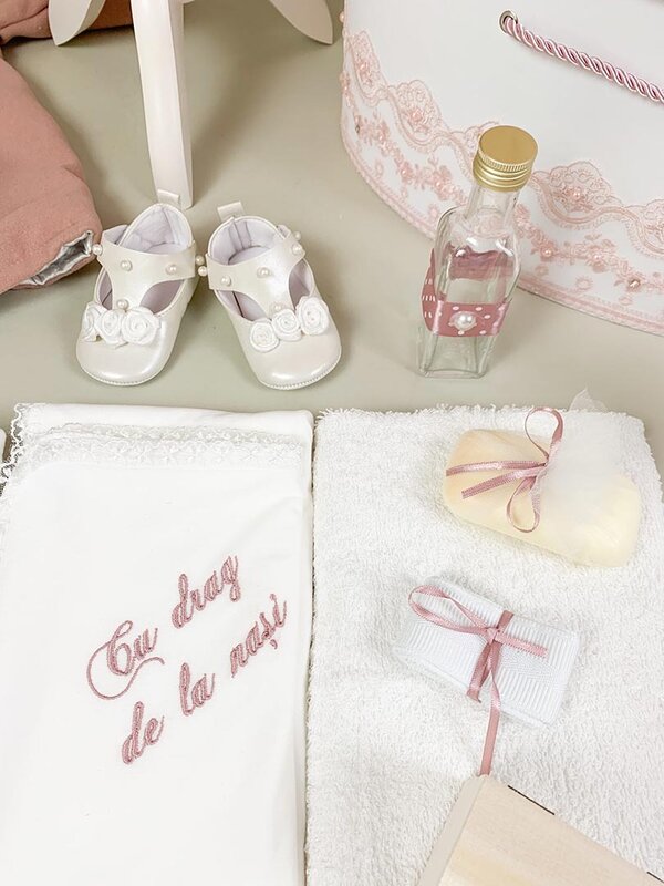 Produs in Romania cu atentie la detalii, setul Lavinia poate fi personalizat pentru a va ajuta sa creati o amintire de neuitat pentru botezul fetitei dumneavoastra.