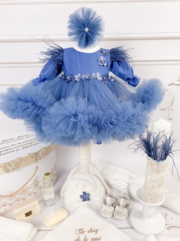 - Rochita albastra - partea superioara este confectionata din tafta. Fusta este ampla si este confectionata din tul iar manecile sunt lungi cu pene aplicate, detalii ce adauga o nota de eleganta. Talia este accentuata cu numeroase floricele.