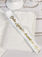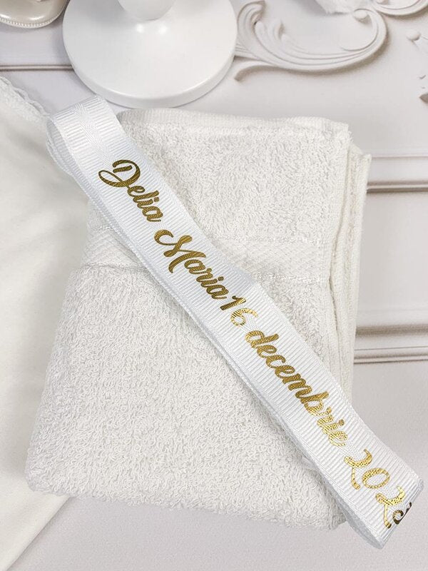 - Un prosop pentru bebelus personalizat cu numele si data nasterii.