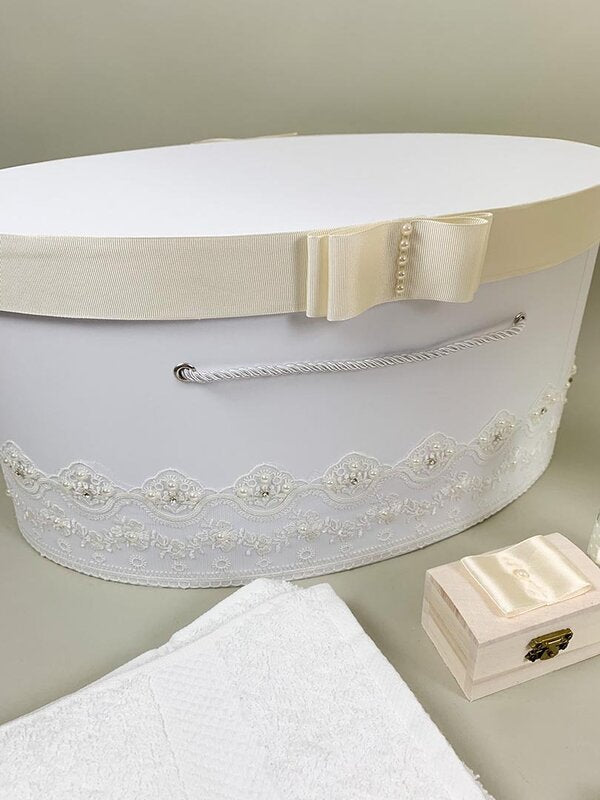 • Cufar mare, alb, cu perle, strasuri si dantela. Are bentita ivoire la capac cu fundita si perle.