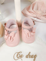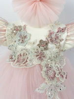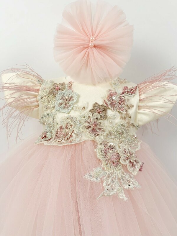 - Rochita roz pal – piesa centrala a acestui set. Cu o fusta ampla din tul, rochita emana delicatete si eleganta. Pe partea de sus a rochitei se gasesc flori 3D cu detalii din dantela brodata si margele aplicate, adaugand un farmec aparte si un aspect distinctiv intregii tinute. Manecile scurte, cu pasmanterie aplicata, aduc un detaliu jucaus si dragalas.