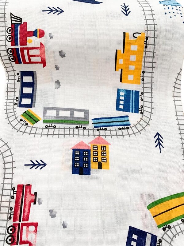 Pret unitar peMuselina nou nascut cu tematica trenuleț rosu cu vagoane pe șina.