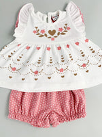 - Bluza alba cu imprimeu floral si inimioare – Realizata dintr-un material moale si placut la atingere, bluza are un design vesel, cu manecute scurte si volanase delicate. Imprimeurile cu floricele si inimioare adauga un plus de farmec si culoare tinutei.