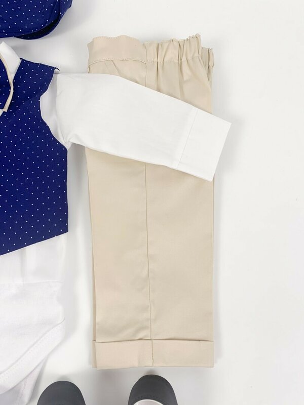 - Pantaloni crem ce completeaza perfect ansamblul, adaugand un aer proaspat si elegant.