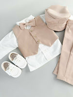 ✔ Vesta crem captusita – Eleganta si confortabila, vesta intregeste perfect costumul si aduce un plus de stil acestei tinute elegante pentru botez.