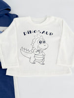 ✔ Bluza alba cu imprimeu cu dinozaur – Moale si confortabila, completeaza perfect ansamblul cu un element jucaus.
