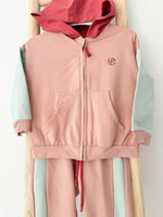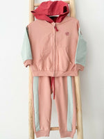 Hanoracul are maneci lungi si o gluga vesel colorata, iar pantalonii sport sunt prevazuti cu elastic in talie si mansete, oferind o potrivire comoda si libertate de miscare.