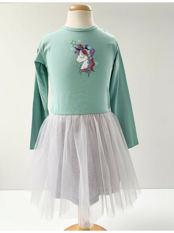 Partea superioara a rochitei este decorata cu un imprimeu adorabil cu unicorni, aducand un strop de magie si farmec in garderoba micutei dumneavoastra. Fustita din tul adauga un aer elegant intregii tinute, oferind libertate de miscare si confort pe tot parcursul zilei.