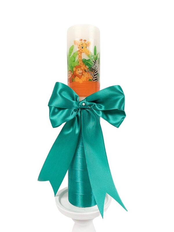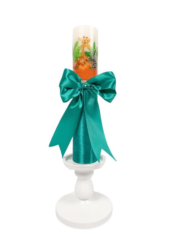 Pret unitar peLumanarea este personalizata cu adorabile animalute si o fundita satinata in nuanta verde. Acest detaliu adauga o nota de delicatete si farmec, reflectand bucuria si puritatea acestui moment special.