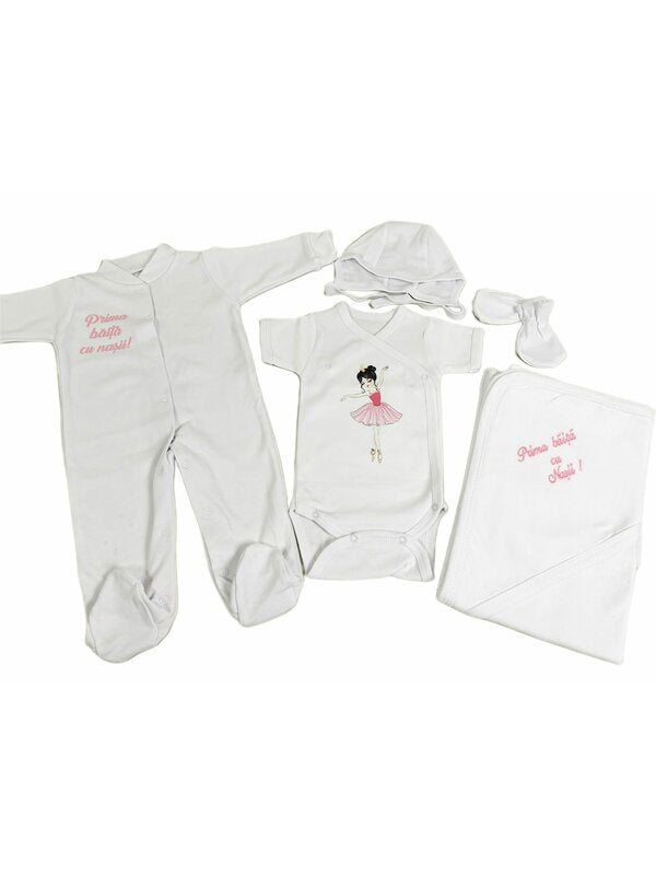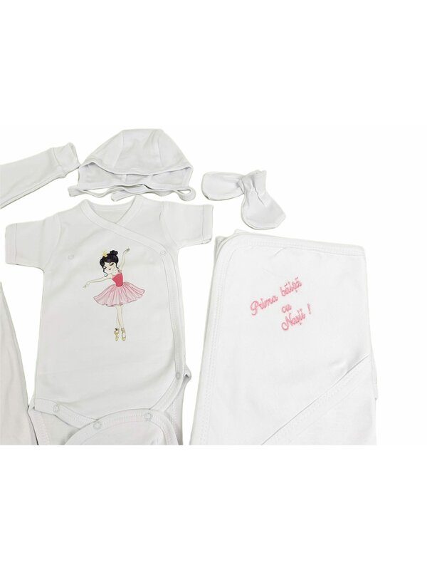Set de baie pentru bebelusi, personalizat cu indragitul personaj Balerina , cu 5 piese incluse: prosop, salopeta,body, caciula, mănuși.
