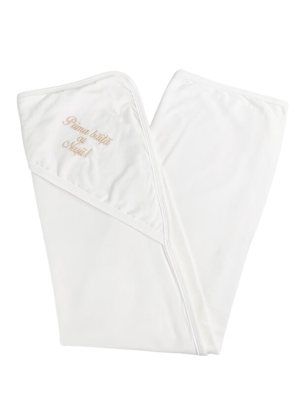 Capisonul protejeaza capul bebelusului, mentinand caldura, iar broderia cu mesajul "Prima baita cu Nasii!" transforma prosopul intr-o amintire unica si emotionanta.