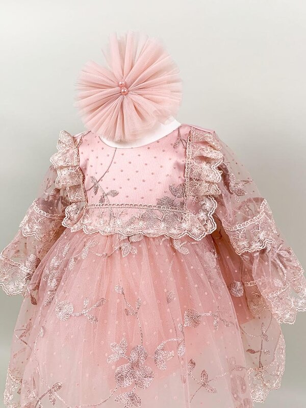 - Rochita roz, realizata cu atentie la detalii si din materiale fine, este cu siguranta piesa centrala a acestui set. Cu croiala sa lejera si dantela delicata, rochita ii va conferi micutei tale un aspect angelic si feminin. Este o rochita captusita cu bumbac pentru a asigura confortul micutei tale iar inchiderea este cu fermoar. Culoarea roz dulce adauga un strop de delicatete si bucurie, subliniind frumusetea si puritatea acestui eveniment special.