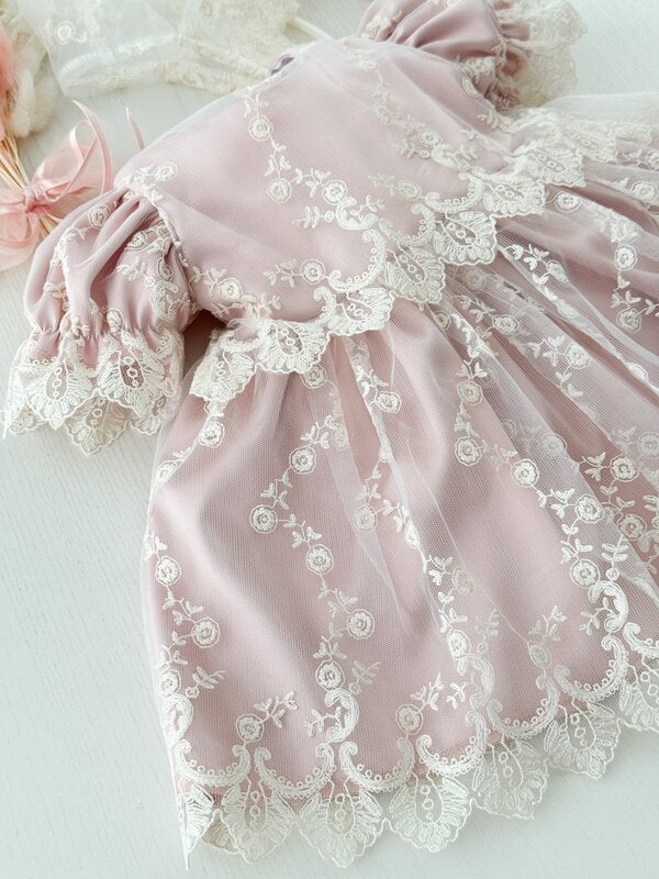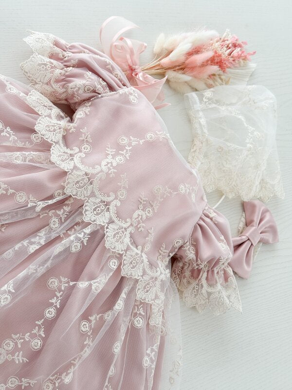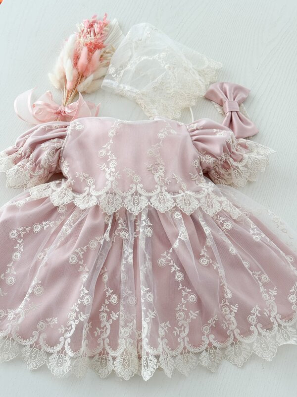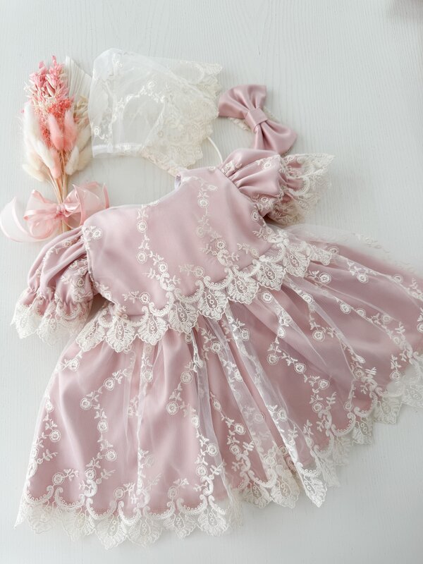 ✔ Rochita roz – Realizata din bumbac de calitate superioara, decorata cu dantela brodata fina, aceasta rochie ofera un aer elegan. Designul cu maneci scurte este perfect pentru zilele calduroase, asigurand libertate de miscare si confort sporit.
