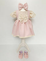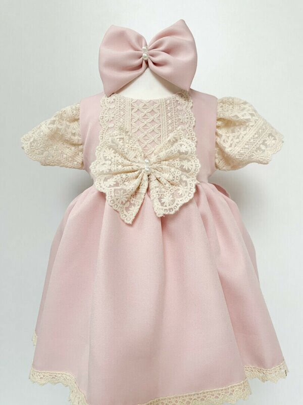 - Fustita este confectionata din bumbac de culoare roz iar la baza fustitei se regaseste dantela incretita, pentru a oferi un plus de eleganta. Are detalii de efect iar talia rochitei este marcata de o fundita eleganta. Manecile sunt scurte si bufante.