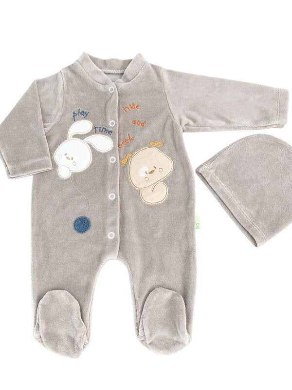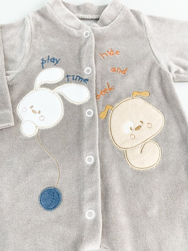 Salopeta maro pufoasa baiat cu catelus si iepuras