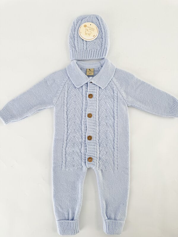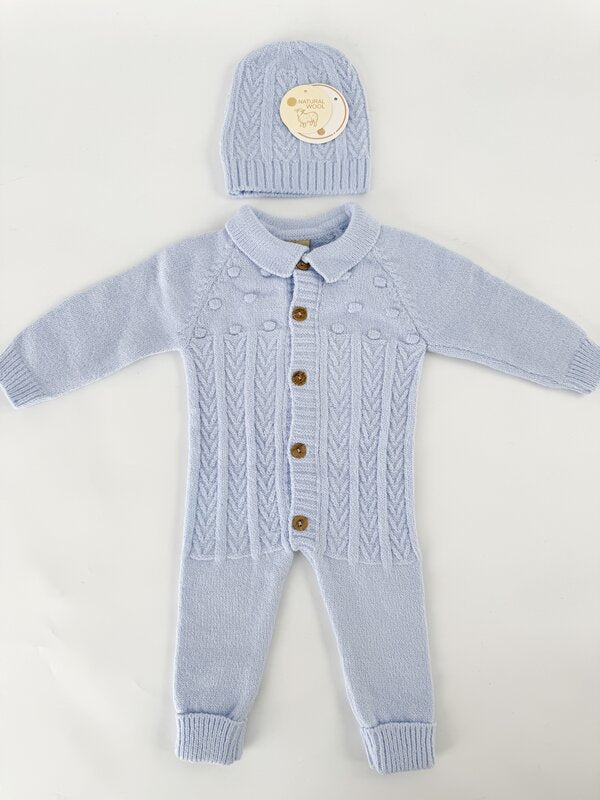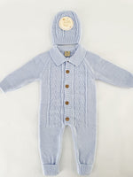 Salopeta tricotata baiat albastra cu caciulita