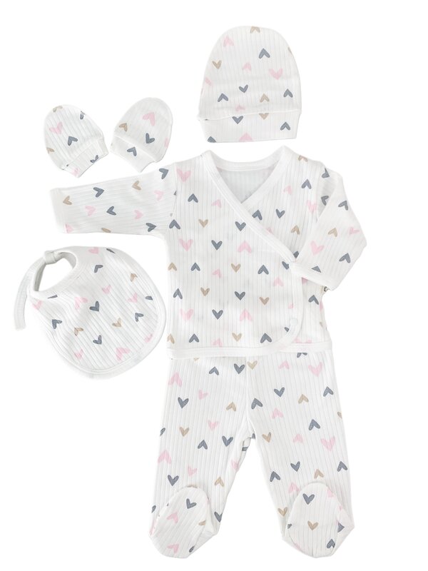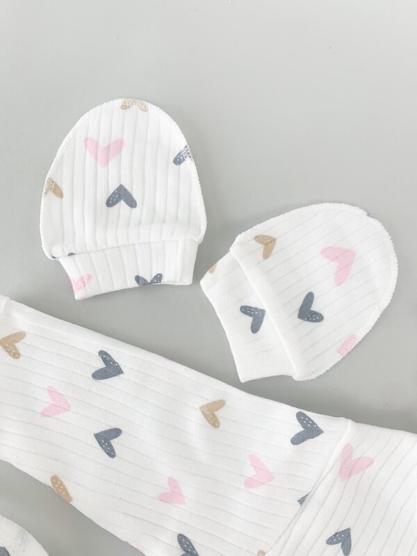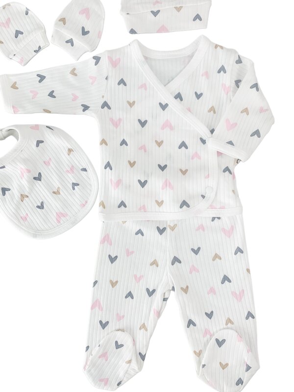 Pret unitar peSetul cuprinde o bluzita cu maneci lungi, prevazuta cu inchidere cu capse, pantalonasi cu elastic, o caciulita moale si elastica, manusi protectoare si o babetica utila, toate decorate cu un delicat model cu inimioare.