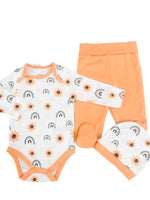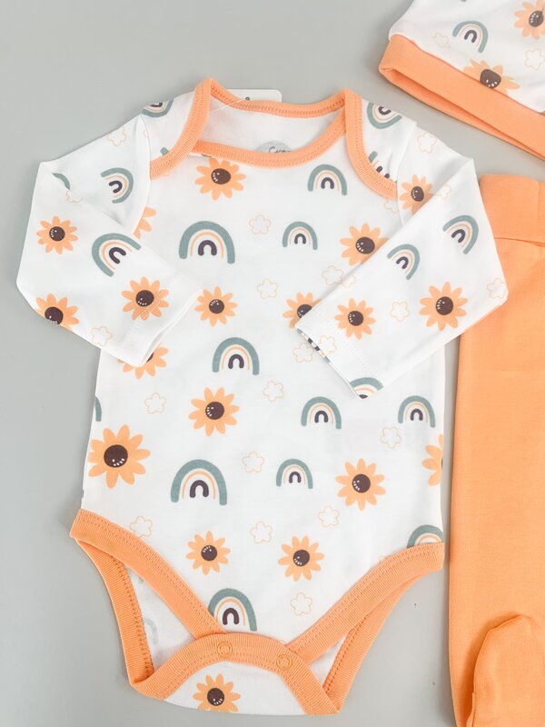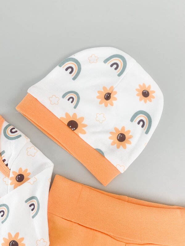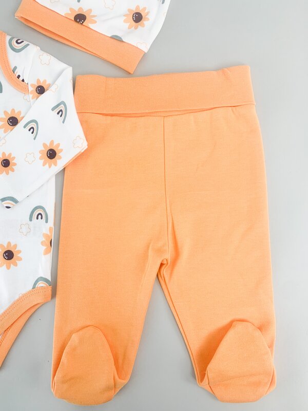 Pret unitar peSetul include o bluzita tip body alba cu maneci lungi si un imprimeu cu floarea soarelui, alaturi de pantalonasi portocalii cu elastic in talie care asigura confort sporit, si o caciulita moale si elastica, perfecta pentru protejarea capsorului.