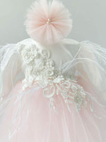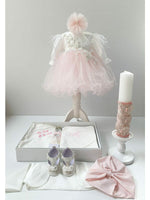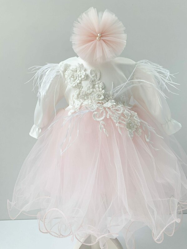 • Rochita pentru botez realizata din tafta alba de o calitate exceptionala, cu numeroase flori albe, perlute si margele delicate aplicate cu migala pe partea de sus. Manecile lungi, cu pasmanterie pretioasa, ofera un plus de rafinament, iar la baza sunt incretite. Fusta ampla din tul de culoare roz pal ii confera rochitei o lejeritate si eleganta aparte. Impreuna cu partea superioara, creeaza un ansamblu incantator pentru mica printesa.