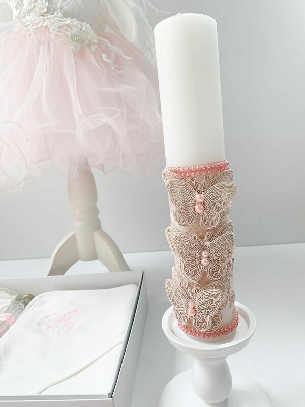 • Lumanarea pentru botez, decorata cu fluturasi si numeroase perlute, emana o lumina blanda si purificatoare pentru noul inceput al copilului vostru.
