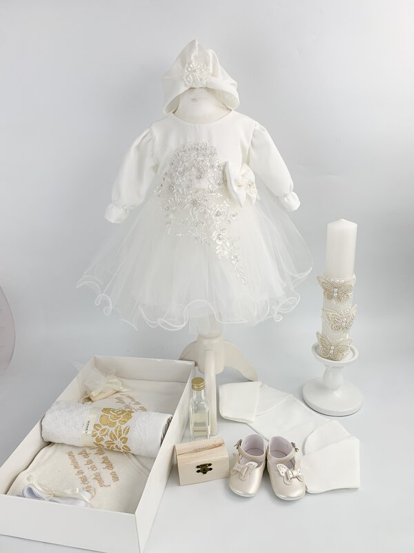 ✔ Rochita alba cu maneci lungi, realizata dintr-un material fin, captusita integral cu bumbac 100% pentru confort sporit. Fusta ampla din voal creeaza un efect diafan, iar dantela brodata si fundita delicata din talie adauga un detaliu fermecator. Inchiderea cu fermoar la spate este practica si discreta.