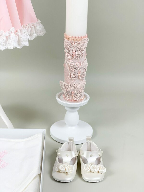 Lumanare pentru botez confectionata din ceara alba de cea mai buna calitate. Este accesorizata manual cu voal, dantela, fluturasi 3D din dantela si perlute de culoare roz. Este esentiala pentru increstinarea micutului in biserica. Lumanarea arde fara a scoate fum negru ori a curge.