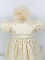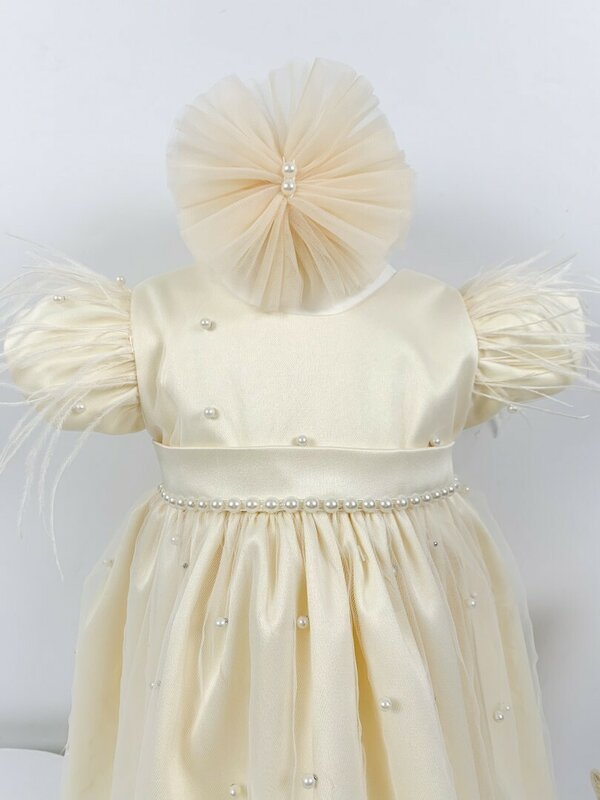 - Rochita crem – Realizata din satin de inalta calitate, aceasta rochie ofera o senzatie de eleganta si confort.Manecile scurte, impodobite cu pene delicate adauga eleganta iar fusta ampla completeaza aspectul nobil al rochiei.Rochia este captusita cu bumbac pentru confort si se inchide cu un fermoar, asigurandu-va ca micuta se simte minunat in fiecare moment.