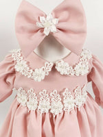 Culoarea roza adauga o nota angelica, iar floricelele minutios aplicate aduc un farmec aparte. Talia este accentuata si ea de multe floricele si perlute.