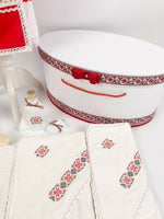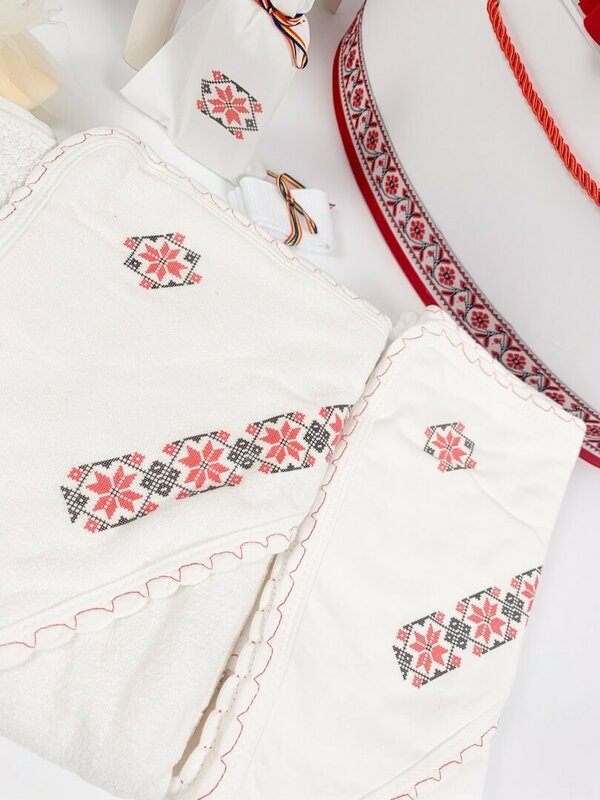 - Vesta rosie – este brodata cu motive traditionale romanesti, adaugand autenticitate setului.