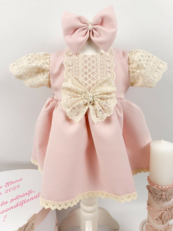 Fustita este confectionata din bumbac de culoare roz iar la baza fustitei se regaseste dantela incretita, pentru a oferi un plus de eleganta. Are detalii de efect iar talia rochitei este marcata de o fundita eleganta. Manecile sunt scurte si bufante.