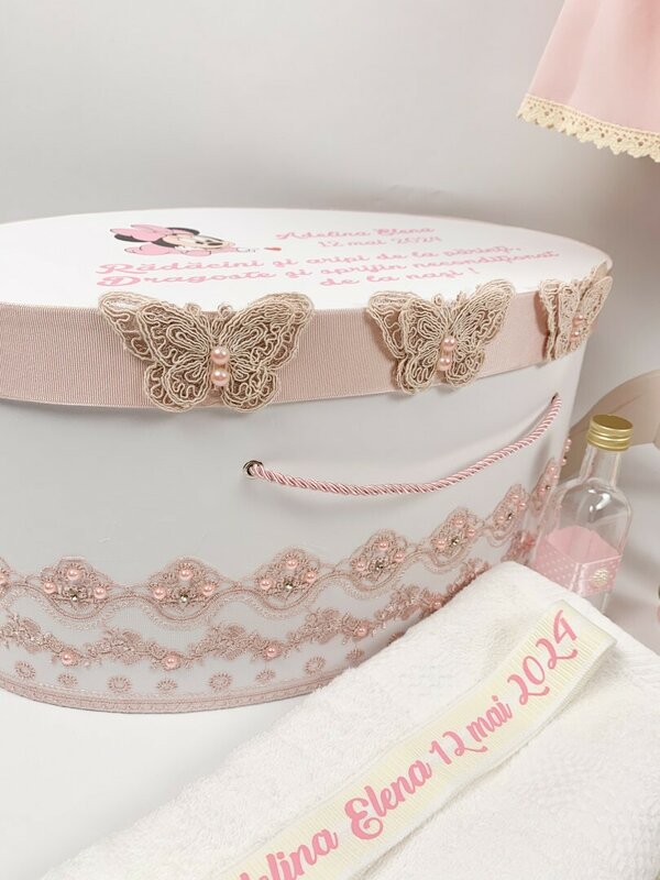 Trusoul este ambalat intr-o cutie mare si incapatoare cu dantela subtila si numerosi fluturasi, personalizata cu un mesaj emotionant.