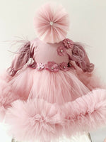 Pret unitar pe- Rochita roz – partea superioara a rochiei este realizata din tafta, conferindu-i un aspect sofisticat si rafinat. Fusta sa ampla este creata din tul, aducand un aer diafan si elegant intregii tinute. Manecile lungi sunt decorate cu pene aplicate.