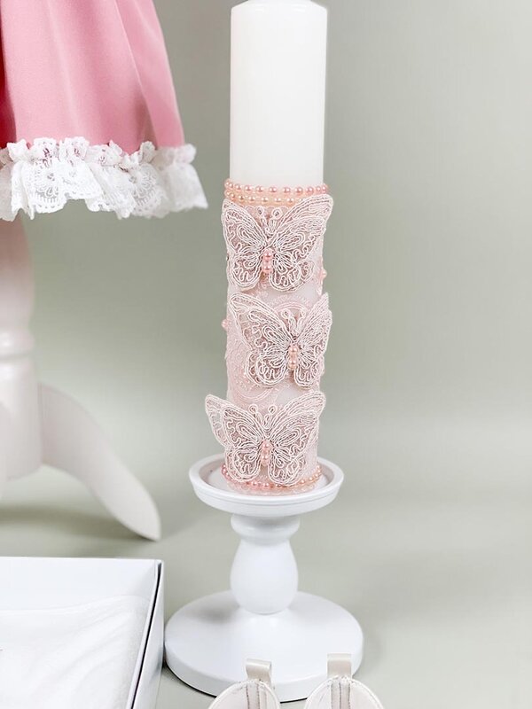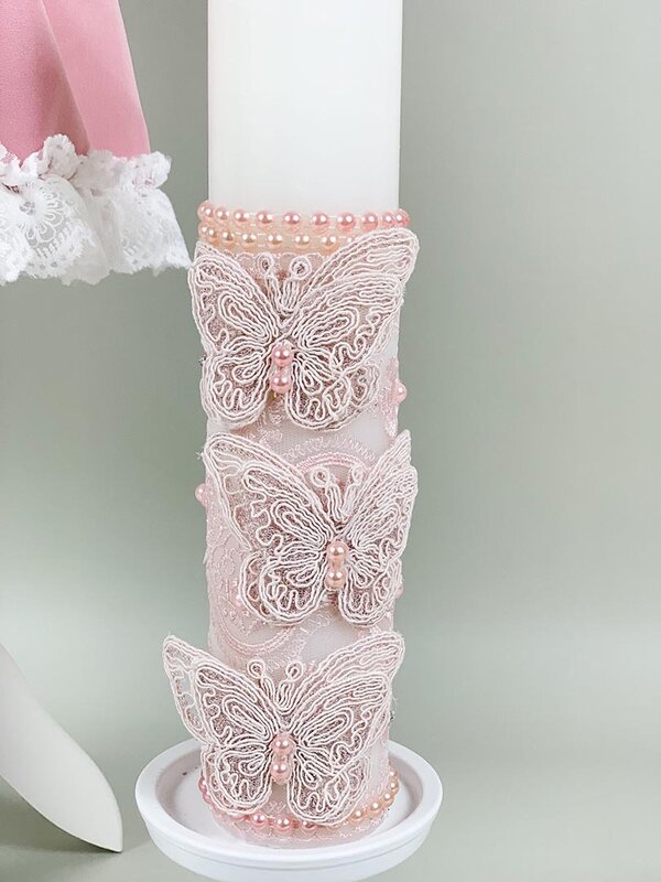 • Lumanare pentru botez confectionata din ceara alba de cea mai buna calitate. Este accesorizata manual cu voal, dantela, fluturasi 3D din dantela si perlute de culoare roz. Este esentiala pentru increstinarea micutului in biserica. Lumanarea arde fara a scoate fum negru ori a curge.