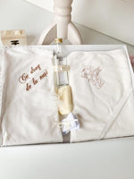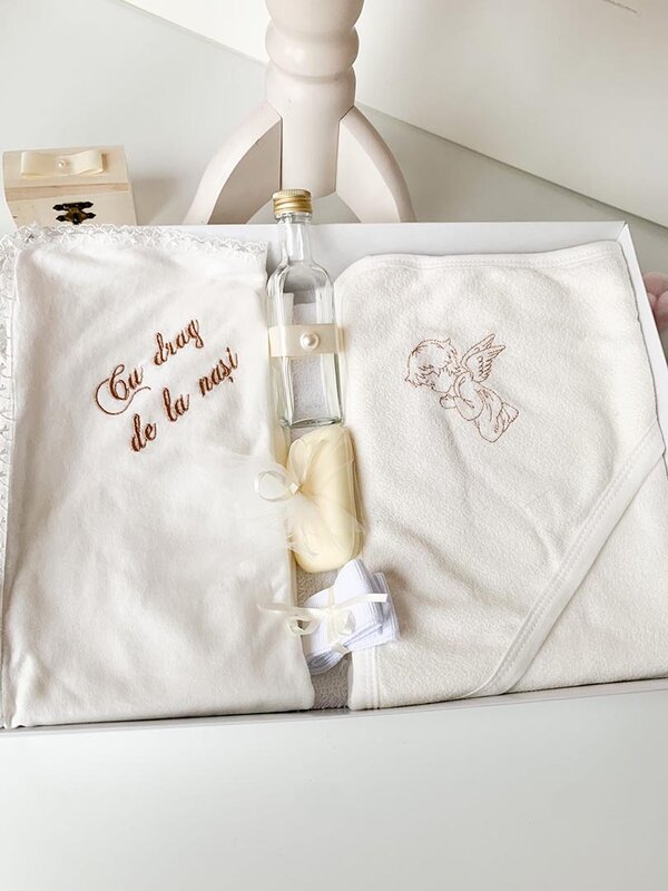 -trusou pentru biserica; prosop bebelus cu gluga si brodat cu ingeras,pânza mir cu dantela si brodat “Cu drag de la nași”, prosop preot, fasa, sticla mir, cutie suvita
